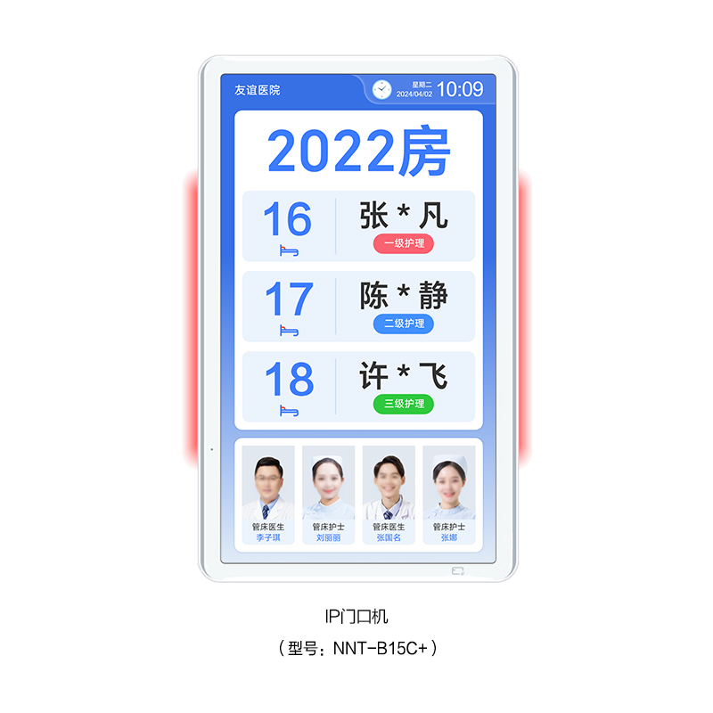 ? 采用15.6英寸觸摸顯示屏,內置燈帶雙側發光設計,壁掛式安裝在病房門口。