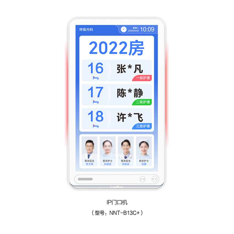 ? 采用13.3英寸觸摸顯示屏,內置燈帶雙側發光設計,壁掛式安裝在病房門口。