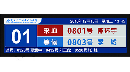 等候區顯示屏顯示:支持42寸以上的液晶顯示器顯示當前各窗口檢驗人員姓名、號碼、狀態、多媒體視頻文件。