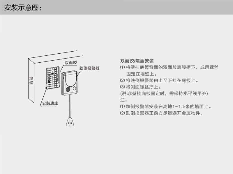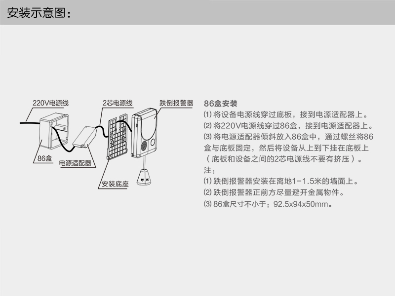 ?、?集中供電:支持電源箱(推薦12V/5A)集中供電,預留RVV2x1.0線,30米內可給2臺跌倒報警器供電(與商務聯系)。