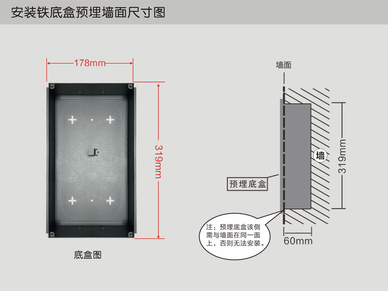 安裝鐵底盒預(yù)埋墻面尺寸圖。
