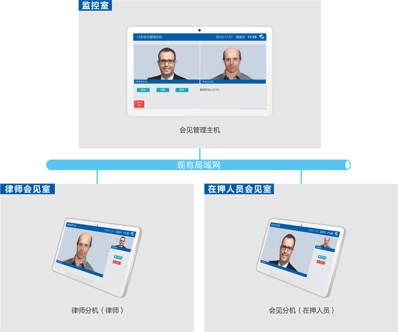 基于IP網絡音視頻通訊技術,主要針對當前監管場所普遍存在的律師會見次數多,看守所會見室不足和律師遠途不便的需求,可實現所內和所外的律師、在押人員之間的高清可視對講功能,進一步保障律師執業權利,提高會見效率和便捷水平。