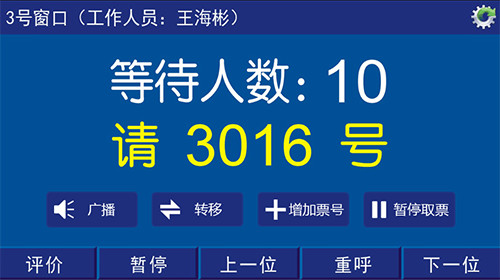 按鍵叫號:有“上一位”、“下一位” 、“重呼”、“叮咚”叫號按鈕,支持手動轉移呼叫。