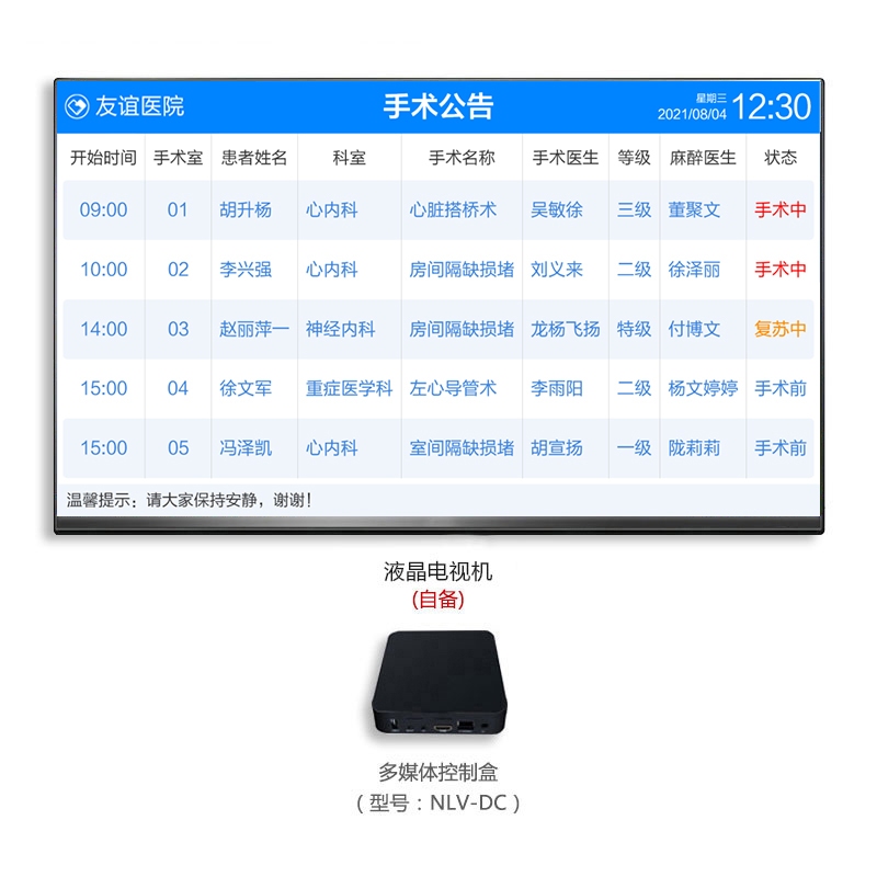 ? 可作為手術公告顯示屏使用,具有信息顯示、數據同步等功能。