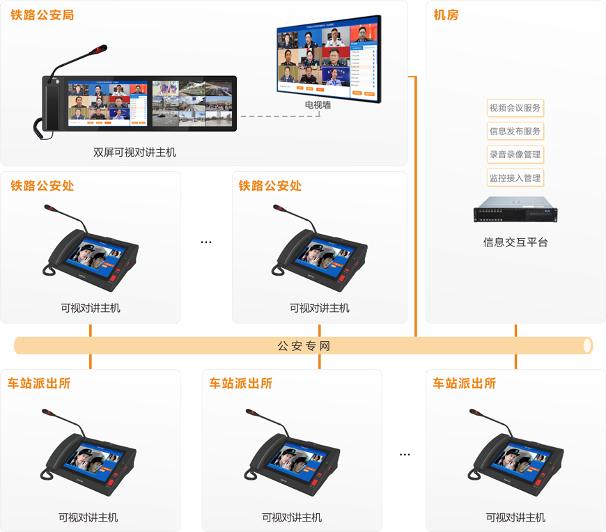 鐵路公安部門工作所涉及的范圍越來越廣,執(zhí)法工作量日益增加,公眾對鐵路公安部門的工作效率、反應(yīng)及應(yīng)變能力等提出了更高的要求。同時,各機(jī)關(guān)之間地理跨度較遠(yuǎn),日常勤務(wù)溝通較頻繁,需建立一套“局--處--所”三級架構(gòu)互聯(lián)互通的“音視訊”通訊指揮系統(tǒng),實(shí)現(xiàn)及時便捷的溝通交流,提升鐵路公安局、鐵路公安處、車站派出所之間日常溝通效率和應(yīng)急處置能力。