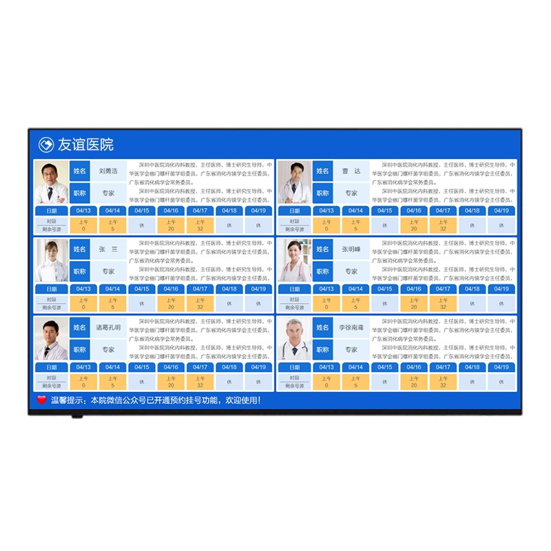 ? 采用65英寸液晶顯示屏,壁掛或吊裝(支架需另購)安裝在大廳、公共休息區等公共區域。