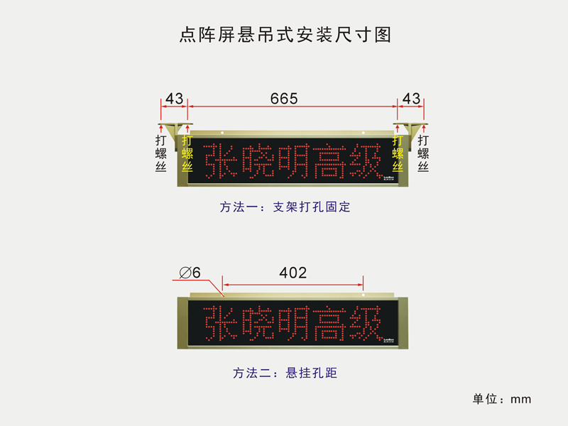 鋁合金邊框,雙面單行五漢字滾動顯示,吊裝在病區走廊。