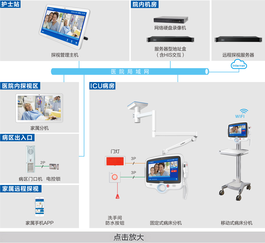 專用于醫院ICU重病房患者與家屬之間的探視對講,是以音視頻對講為主的探視系統。系統基于網絡傳輸,以TCP/IP協議傳輸視頻、音頻和多種控制信號,易于Internet連接和訪問。